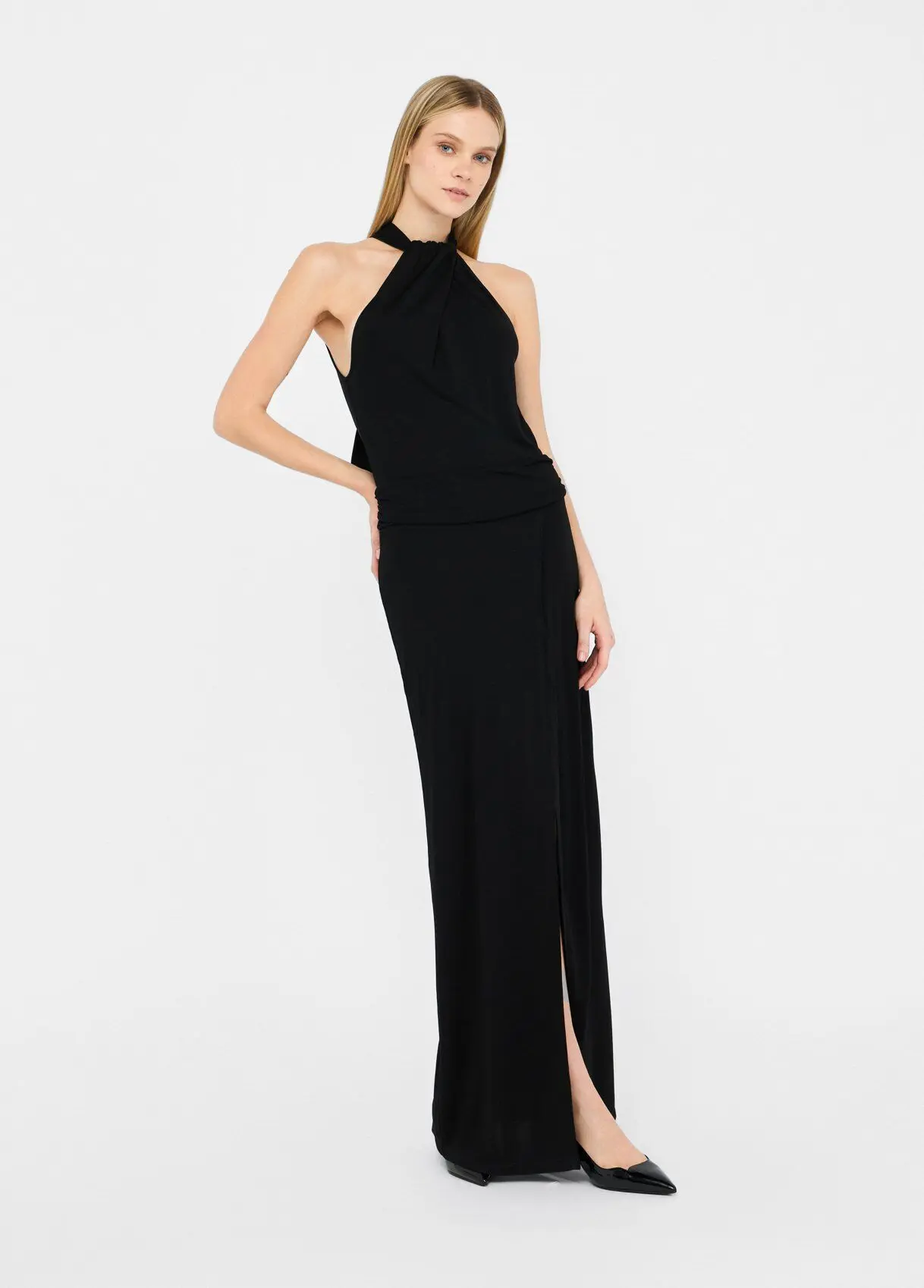 Длинное платье из вискозного интерлока Драпировка Американская пройма с платком сзади Спереди: разрез