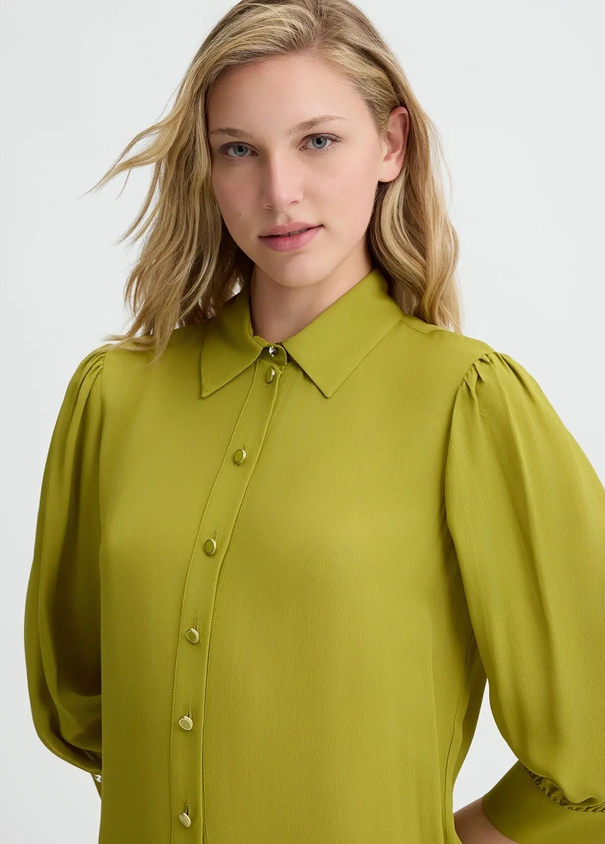 Короткое платье-рубашка Материал: вискозный крепдешин Рубашечный воротник Длинные рукава Манжеты с пуговицей Сзади: металлический логотип Оборка На юбке: складки Застёжка на пуговицы